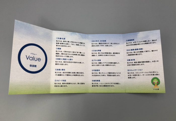 経営方針や行動指針が書かれているカード。社員の意思統一のためにこのようなカードを配布する企業が増えています。