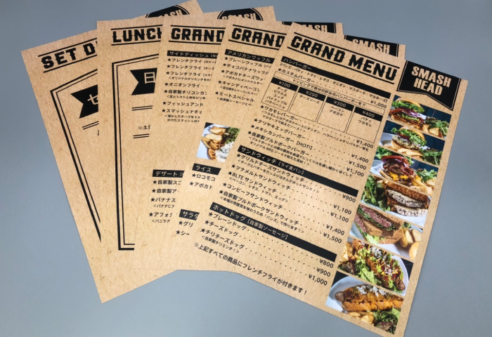 飲食店のメニュー製作もお任せください。必要な部数によって、作成可能な形状が変わります。